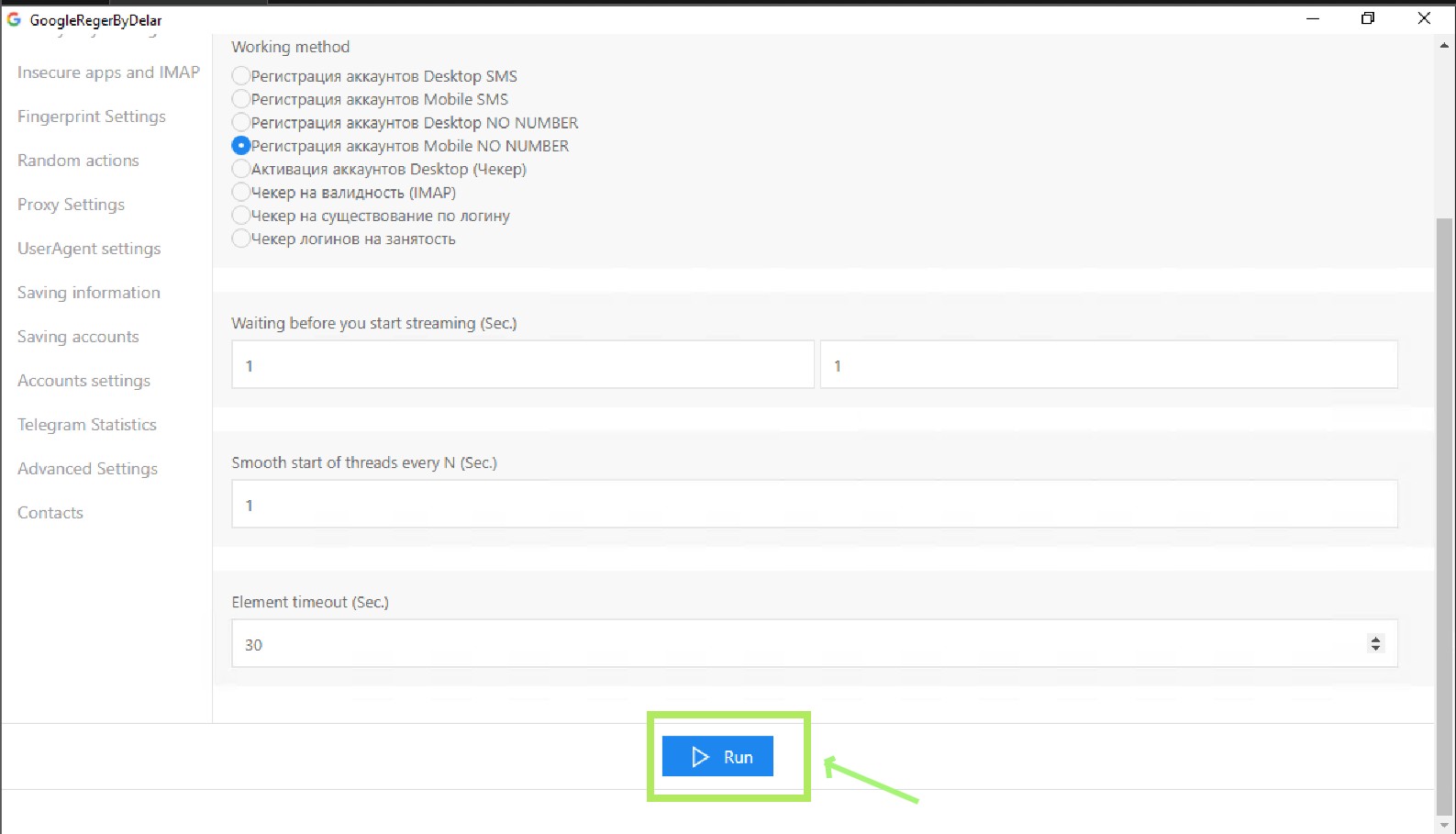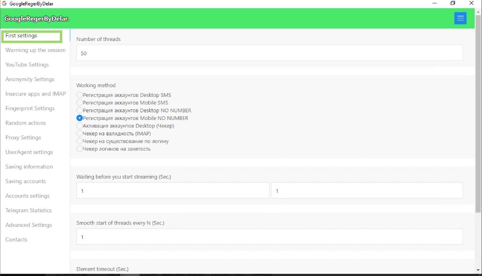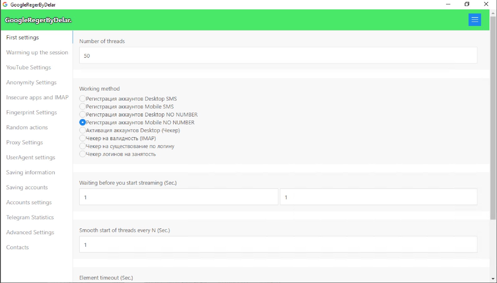 * **Smooth start of threads every N seconds:** Determines how many seconds to wait before starting each thread to avoid detection.
