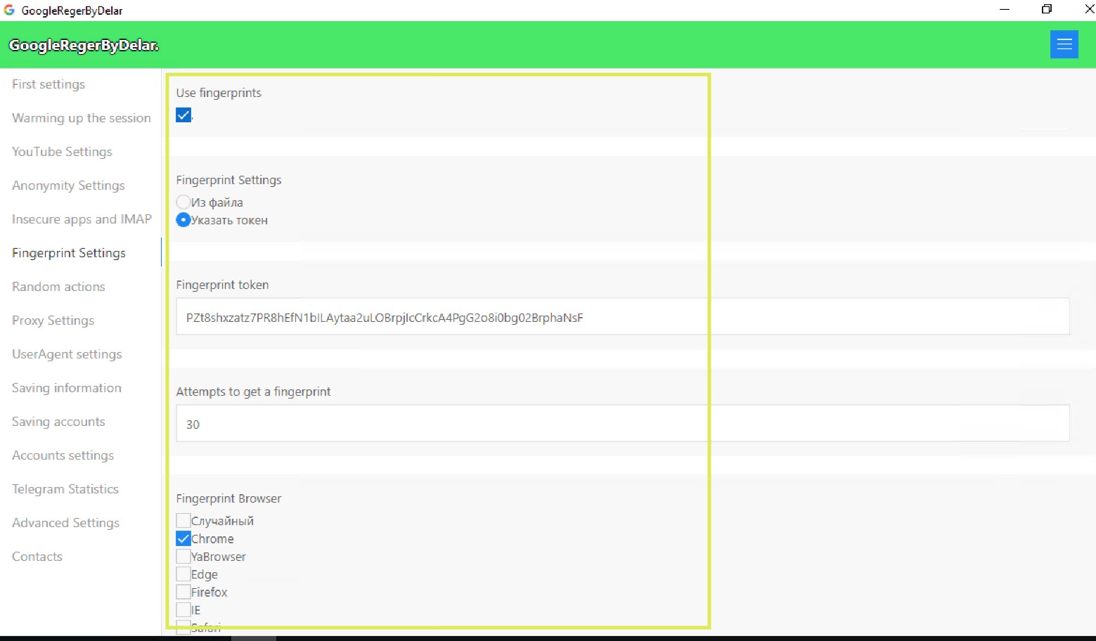 #### **1. Fingerprint Settings (Из файла / Указать токен)**
