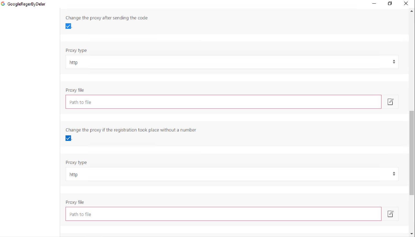 3. For **Change the proxy if registration took place without a number**, add **Proxy type** and **File path**.