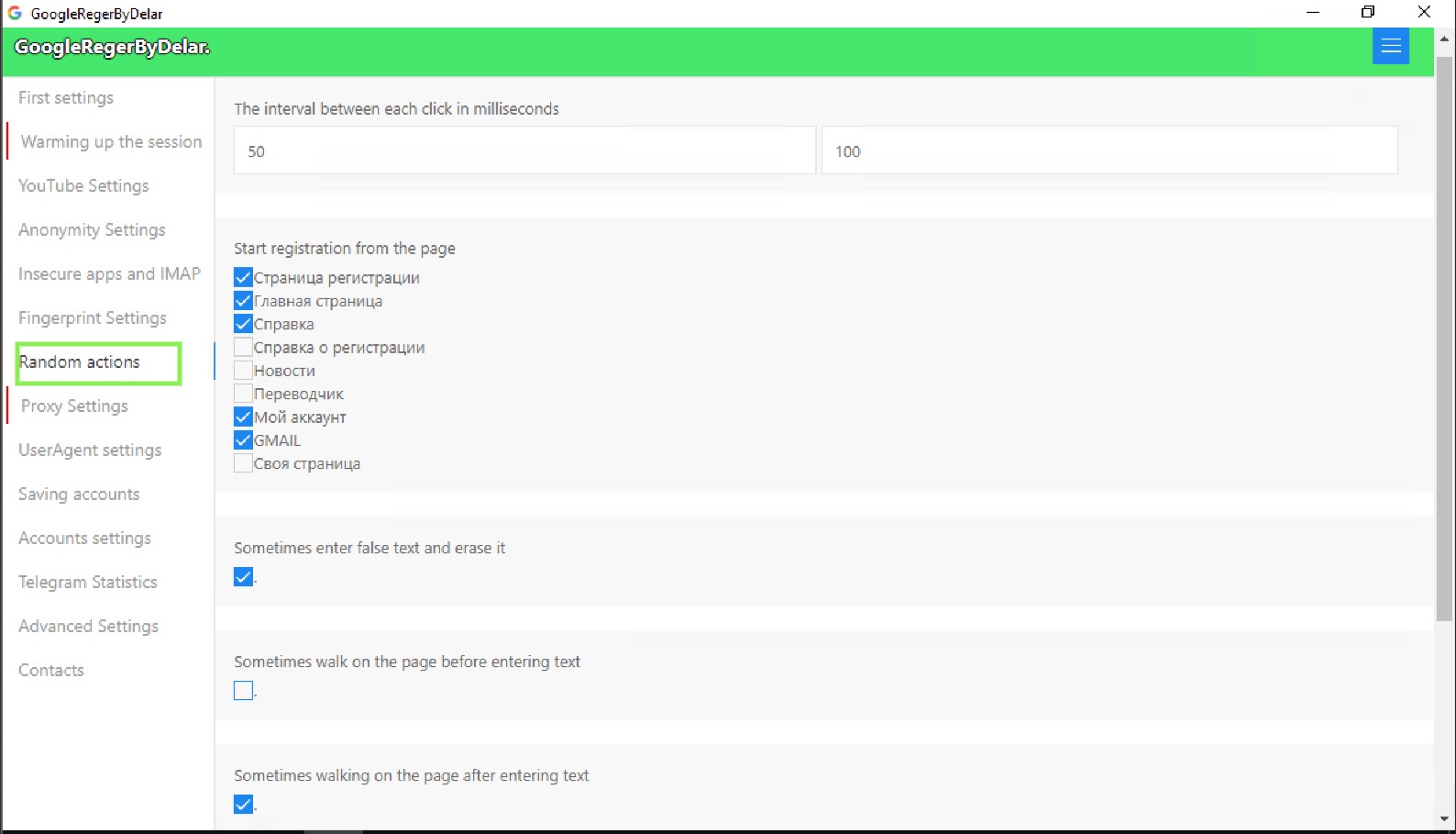 This section allows you to configure actions that simulate human-like behavior during automated processes, such as random clicks, interactions, and text manipulations. These features help mimic natural user behavior and can reduce detection during automated registrations.